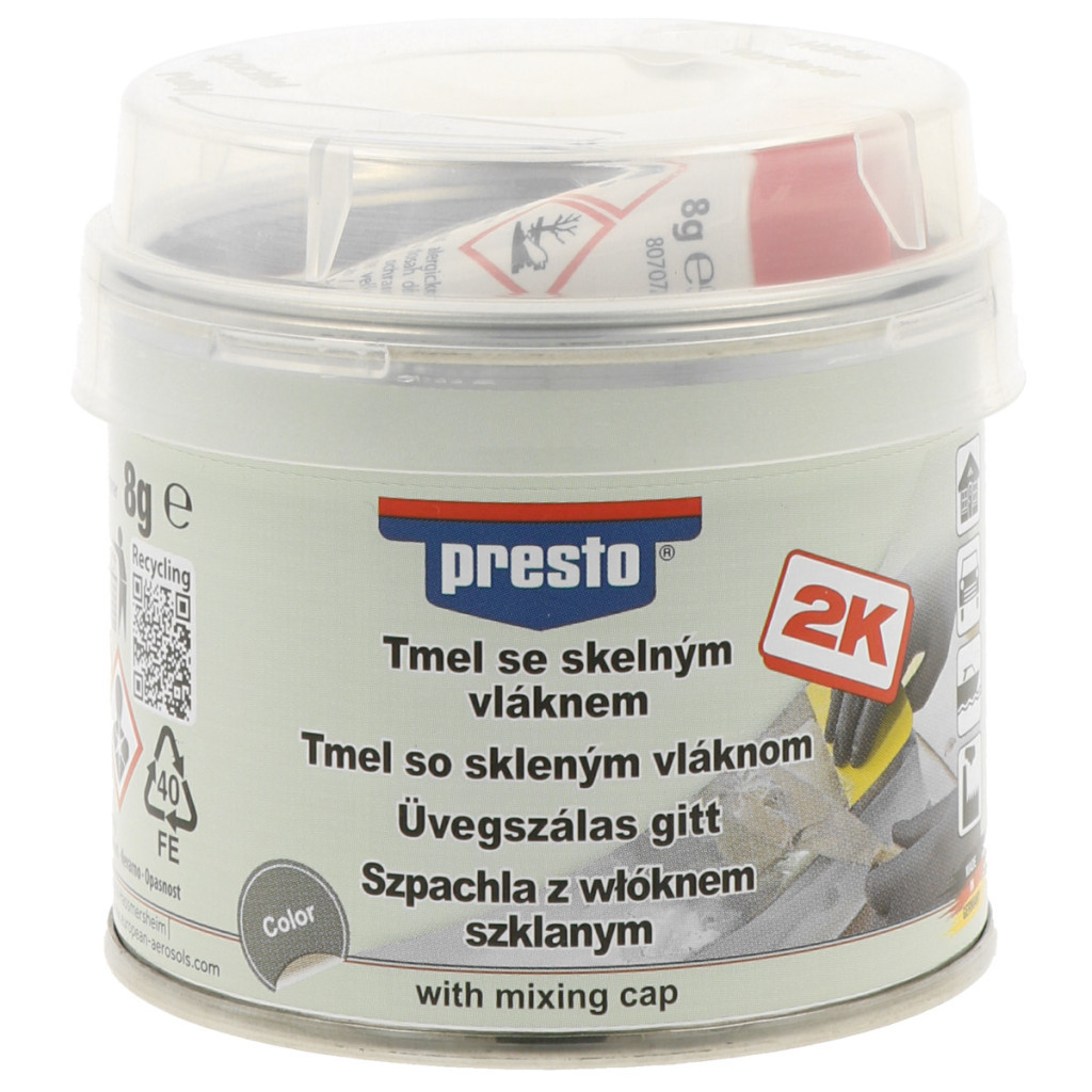 A Presto üvegszálas gitt „sztiroltartalmú” telítetlen poliészter gyantát tartalmaz, hozzáadott üvegszál-részecskékkel és az új NT kötőanyaggal. Kifejezetten alkalmas perforációk áthidalására és stabilizálására, valamint nagyobb felületi egyenetlenségek kitöltésére. Megbízható megoldást nyújt akár 12 mm átmérőjű lyukak javítására is. Ellenáll gyenge savaknak és bázisoknak, hajtógázoknak, oldószereknek, víznek és jégmentesítő sónak.
